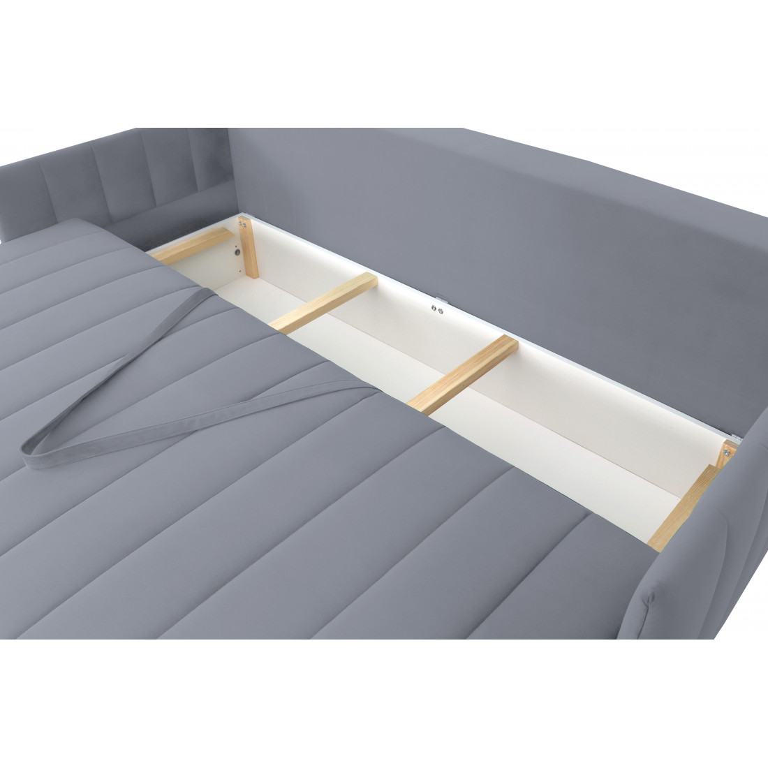 Диван удачно зонирует пространство и дополняет необходимым функционалом. В основании спального места блок независимых пружин для комфортного сна. Вместительный ящик для хранения постельных принадлежностей.