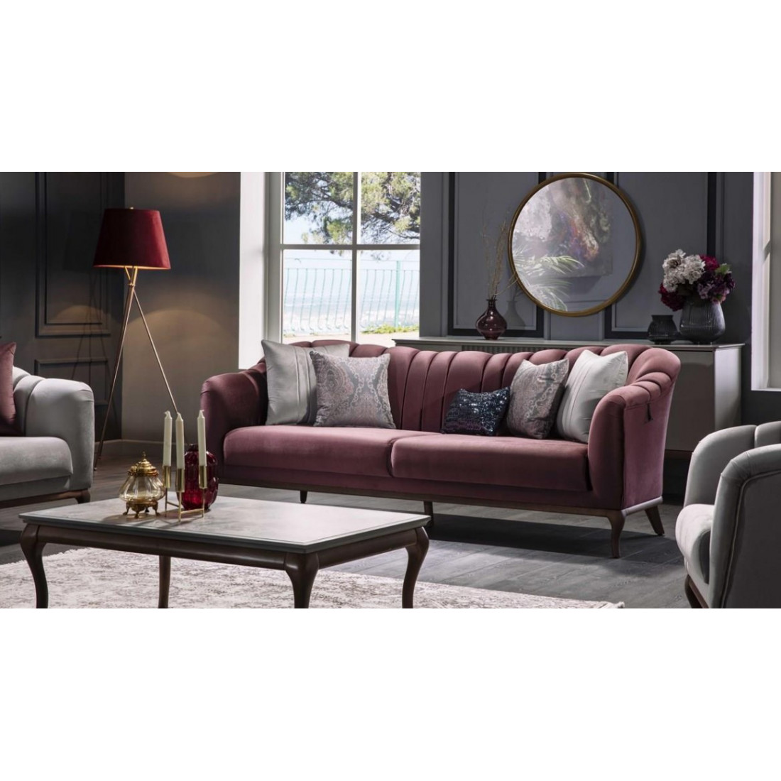 Идеальные вертикальные линии на спинке и подлокотниках выделяют трехместный диван из коллекции "Pesaro" среди конкурентов. Он представлен в нескольких цветовых вариантах: в синих, белых и фиолетовых тонах. В комплект входят пять разнообразных подушек, четыре из которых квадратные и одна маленькая прямоугольная. Высокие ножки, обрамлённые прекрасным декором с древесной текстурой, упростят уборку в доме. Ткань этого дивана невероятно мягкая и очень легко чистится